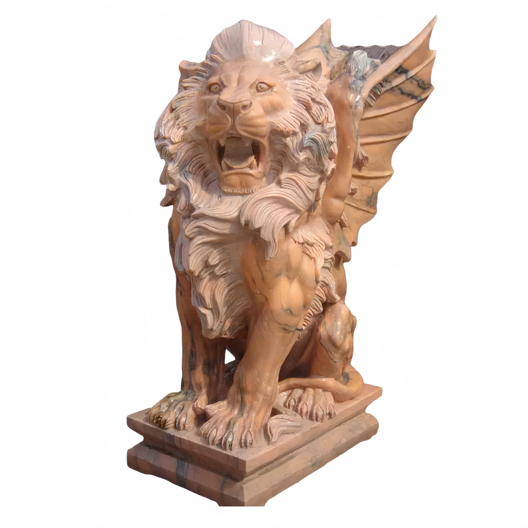 Como a imagem principal é retratada contra um fundo branco limpo, cada detalhe deste guardião é renderizado com uma clareza de tirar o fôlego. A escultura retrata o Leão Alado (Grifo) em uma clássica postura de sentinela sentada, com a cabeça erguida em um rugido perpétuo que personifica força e vigilância. A habilidade do artesão é evidente nos cachos profundos e ondulados da crina, nos intrincados padrões de penas das asas abertas e na poderosa musculatura. A pedra escolhida, numa tonalidade quente castanho-avermelhada com veios naturais e contrastantes, garante que cada peça seja única, com variações que acrescentam ao seu carácter e apelo intemporal. O substancial pedestal quadrado proporciona uma base sólida e digna, completando a sua silhueta autoritária.